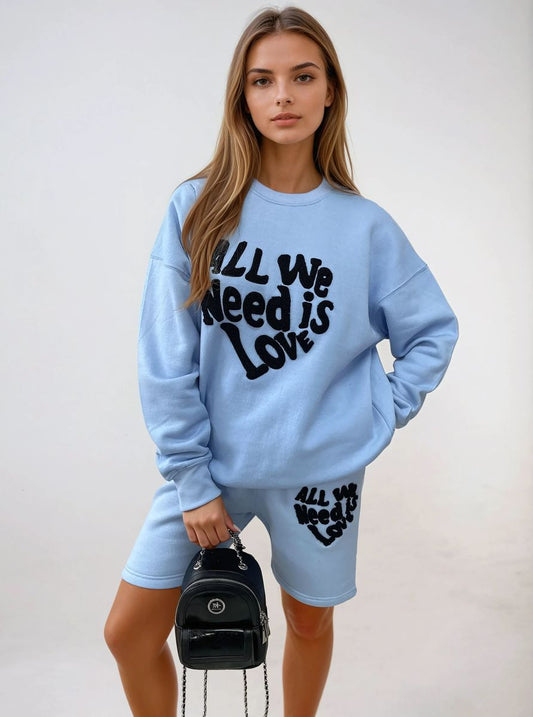Love Side Slit Cycling Short and T-Shirts Co-Ord Two Piece Set with Front Love Slogan