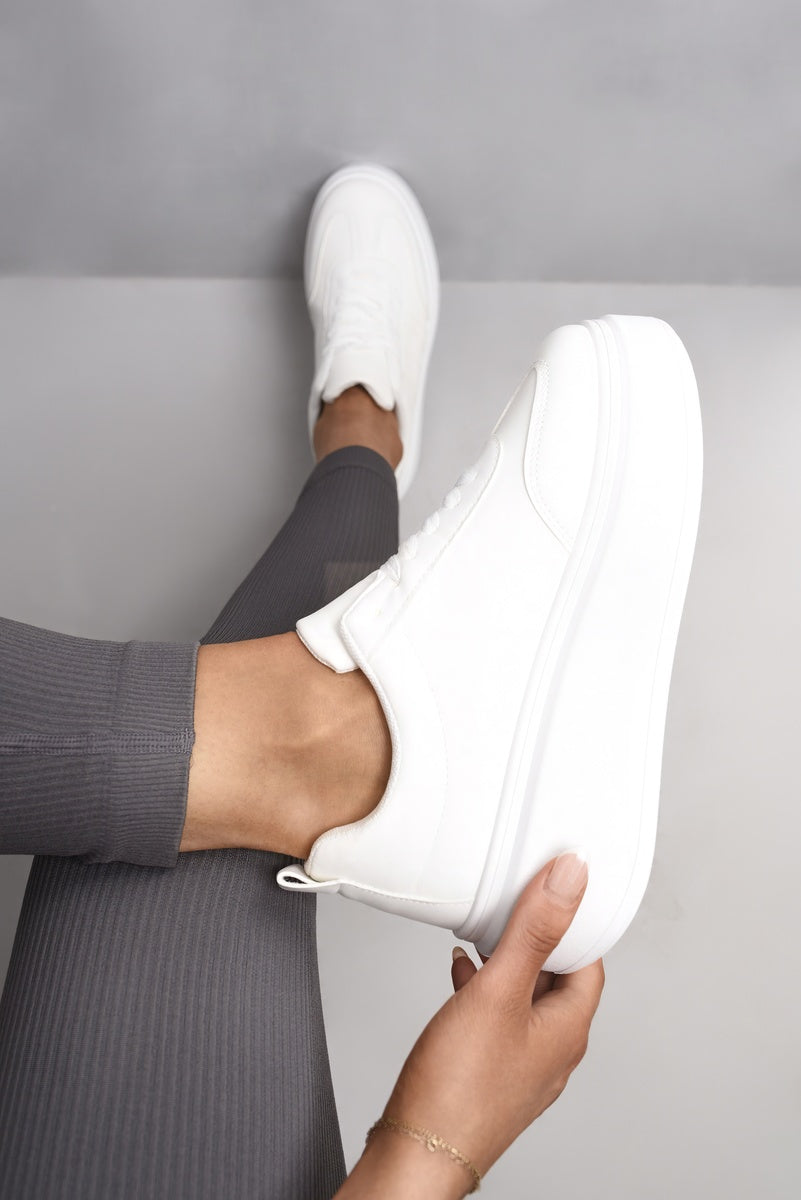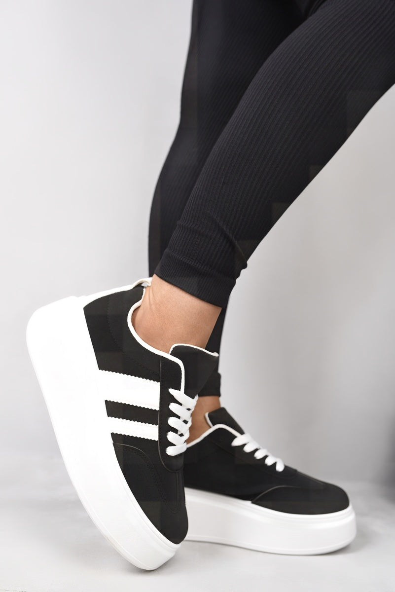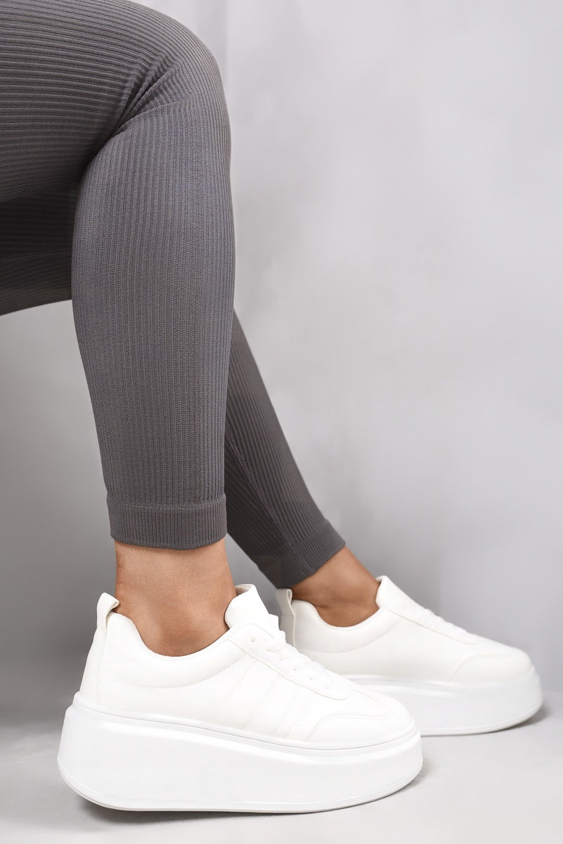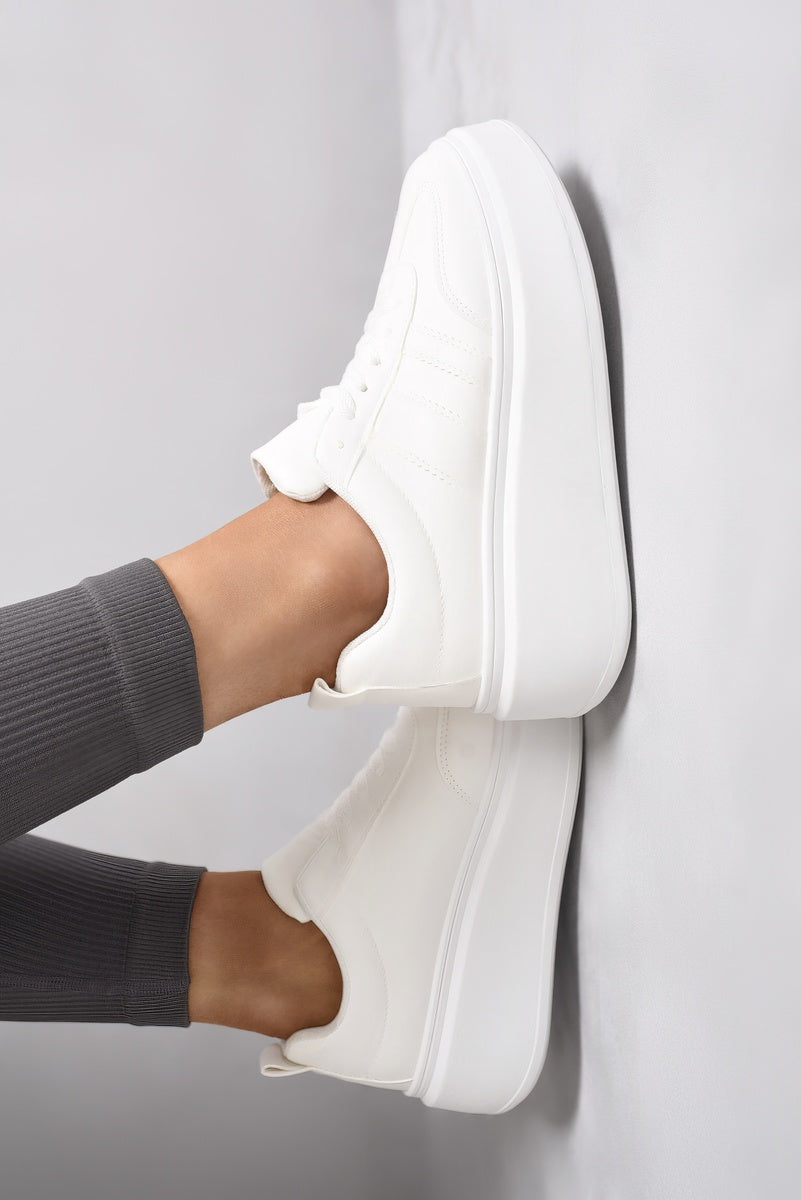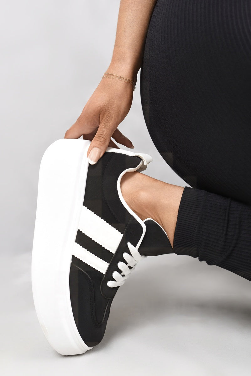 Bold, clean, and seriously comfy. These chunky trainers feature contrast stripe detailing and thick white soles for a sporty vibe. Perfect for casual styling with jeans, joggers, or a ribbed co-ord.