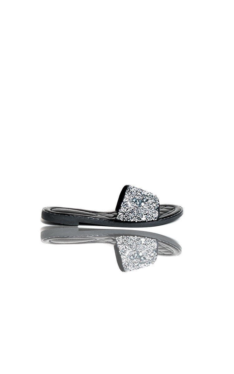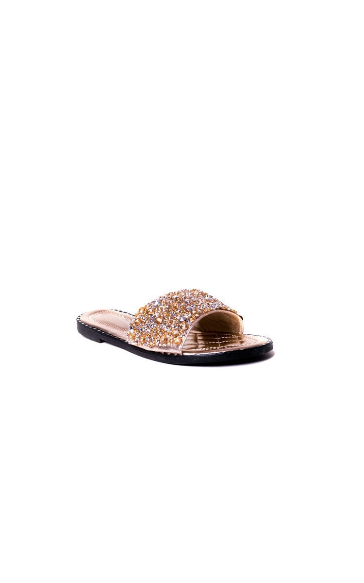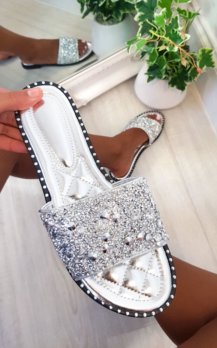 our SOFIE sandals feature faux leather material, metallic finish, diamante and crystal embellishment and slip on slider style. Perfect for your summer vacay, add a floral midi for a seriously cute look.