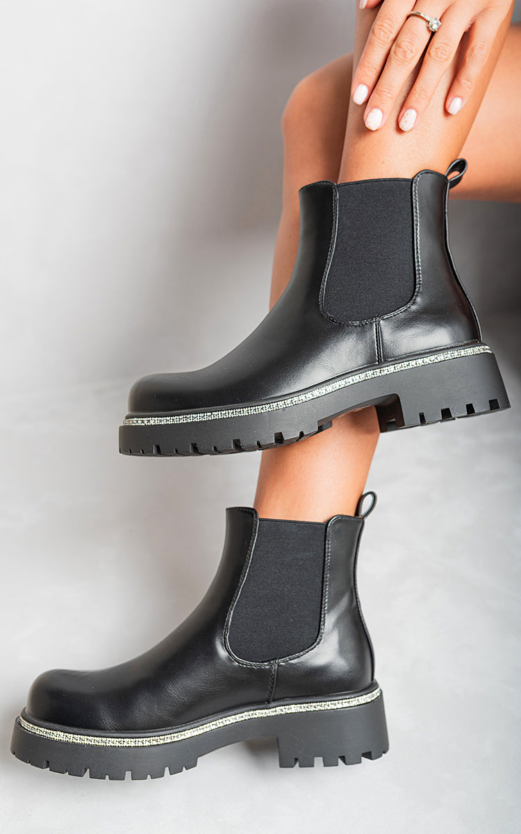 Elevate your style with the Kayla Faux Suede Diamante Chelsea Ankle Boots – where comfort meets extravagance. ??️