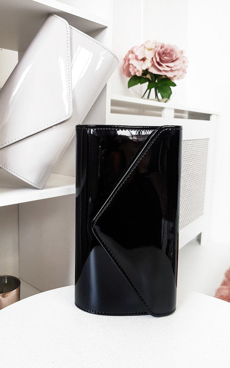 our HEIDI bag features clutch style, envelope front, all over faux patent leather material and button closure with detachable gold chain shoulder strap.