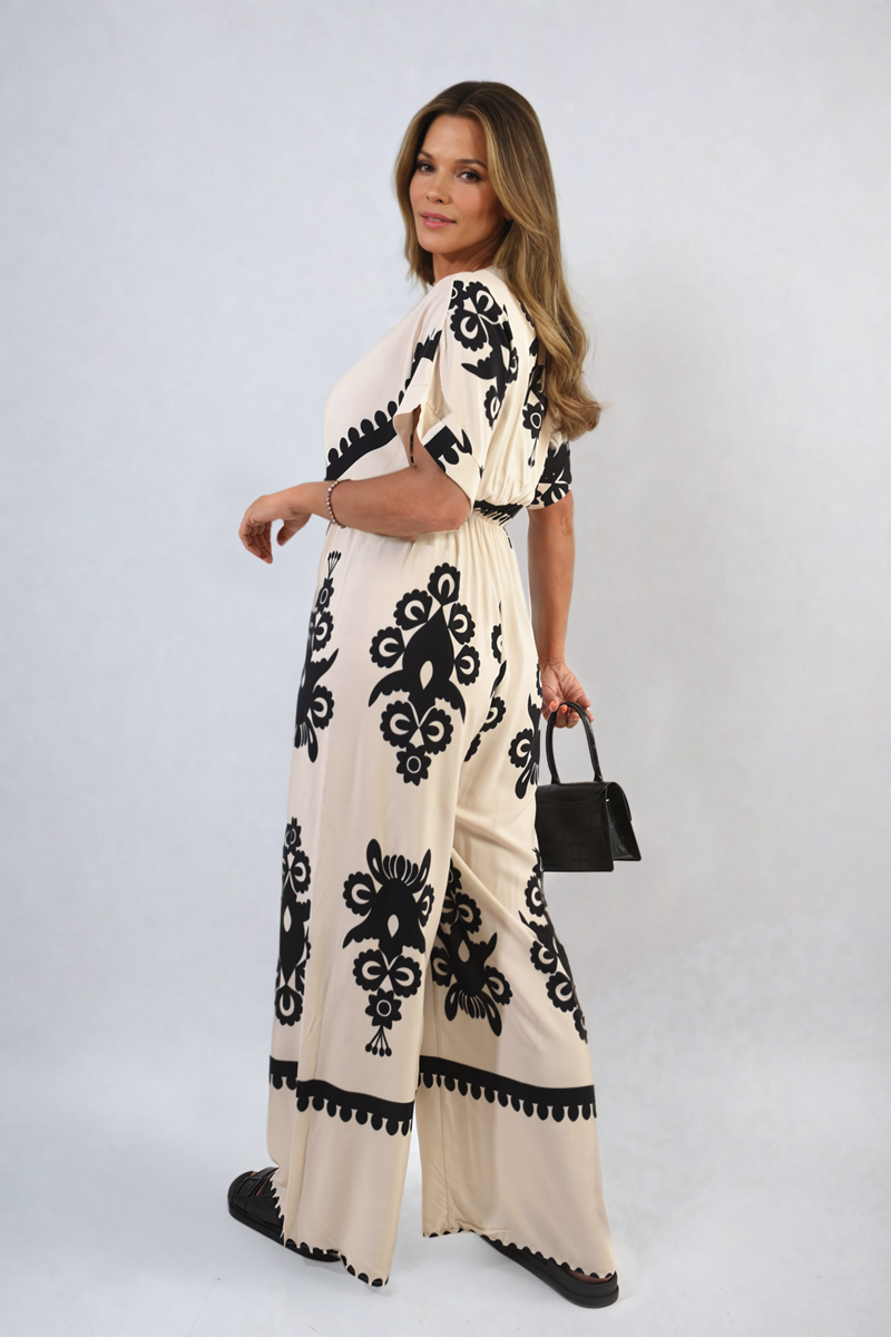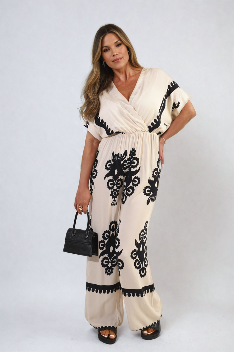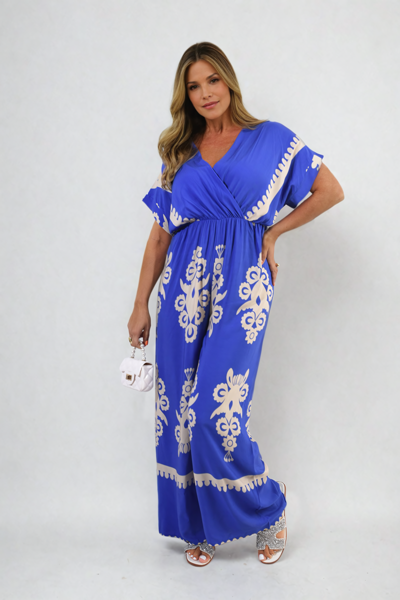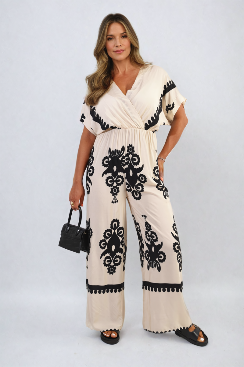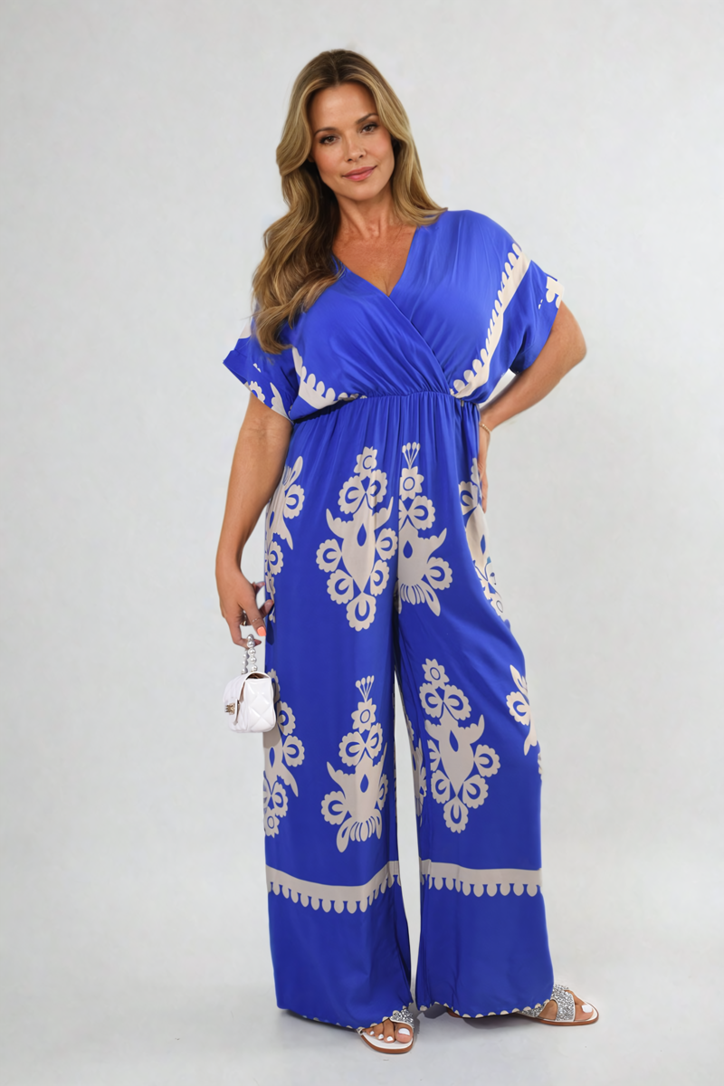 Introducing the Romina Printed Cross Front Wide Leg Jumpsuit! 👗✨ This stylish and versatile jumpsuit is perfect for those who love to combine bold prints with contemporary design.