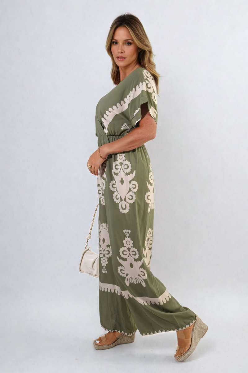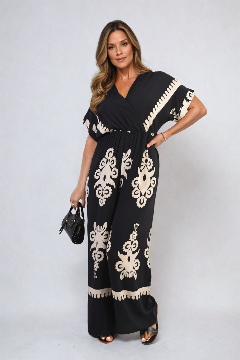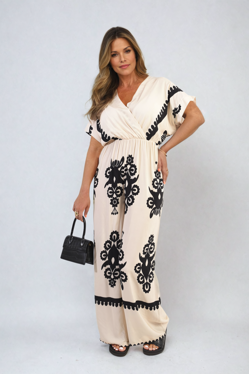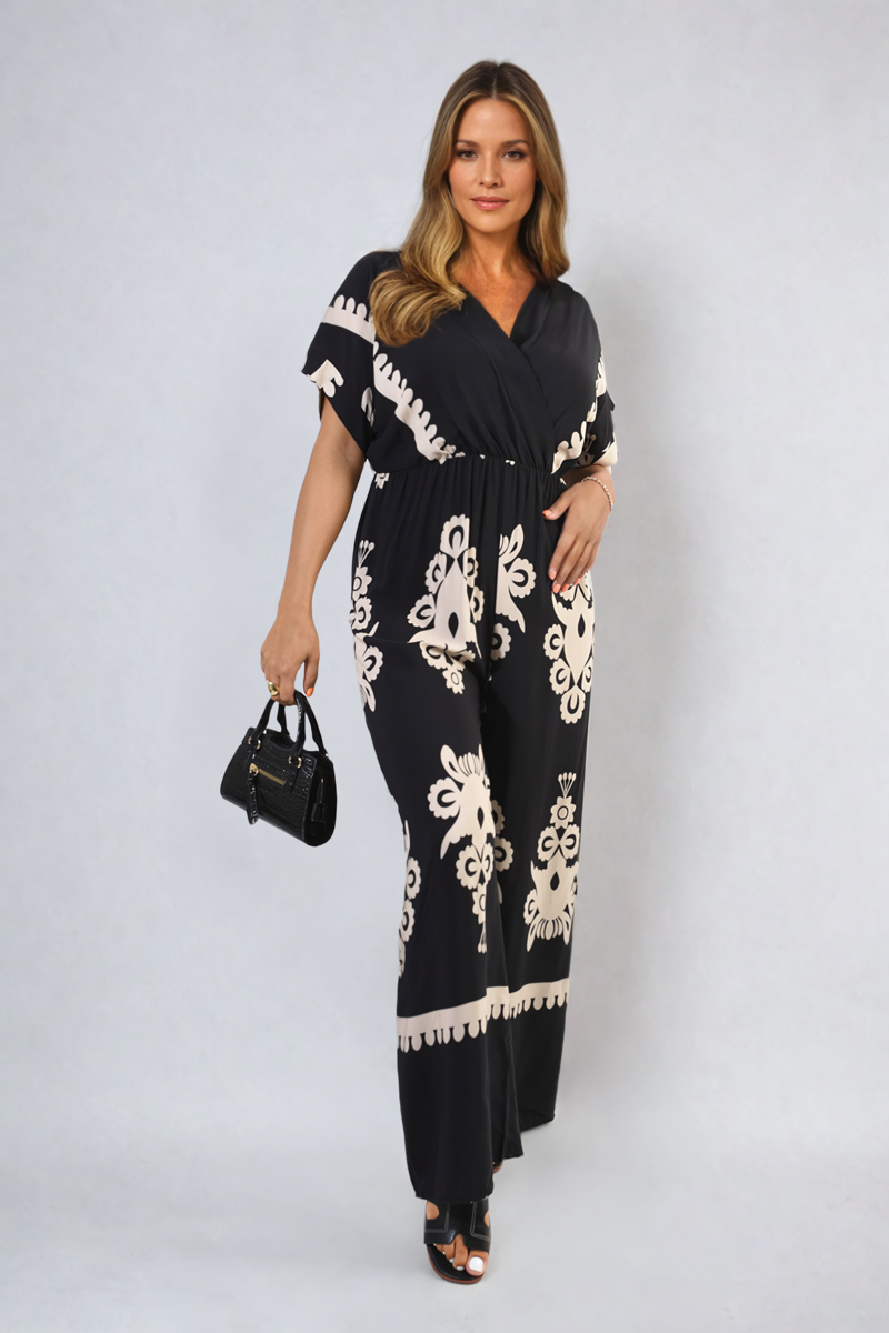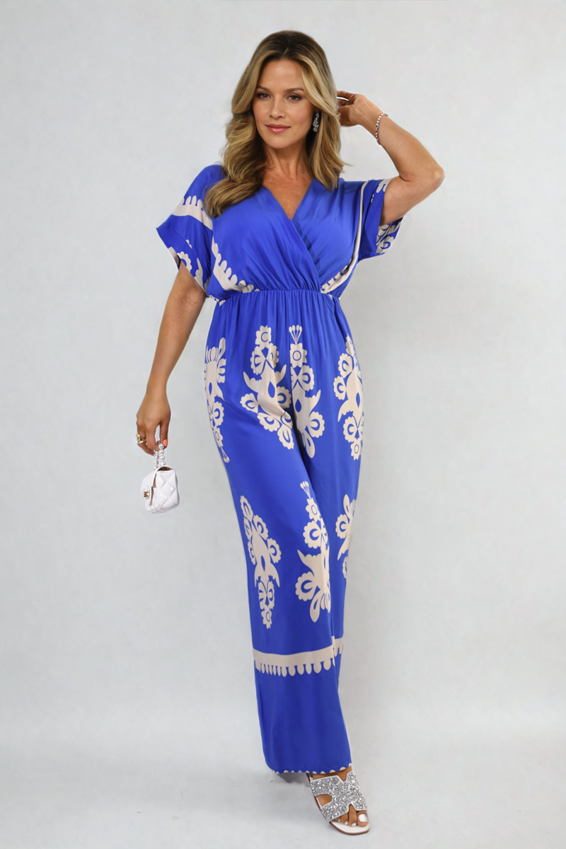 Whether you're attending a summer soiree 🎉, a brunch date ☕, or a night out on the town 🌃, the Romina Printed Cross Front Wide Leg Jumpsuit is your go-to outfit. Pair it with heels or sandals and accessorize with statement jewelry to complete your look. 👡💎