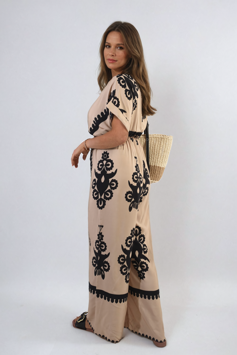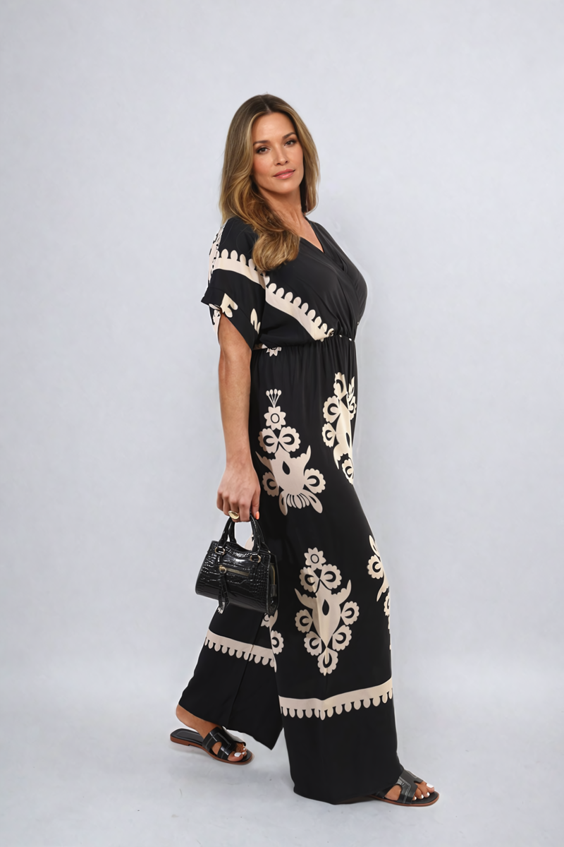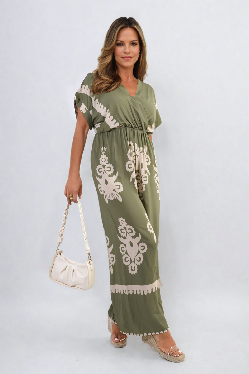 The Romina jumpsuit features a striking print that adds a touch of flair to your wardrobe. The cross-front design creates an alluring and sophisticated neckline, making it a standout piece for any occasion. 🌟