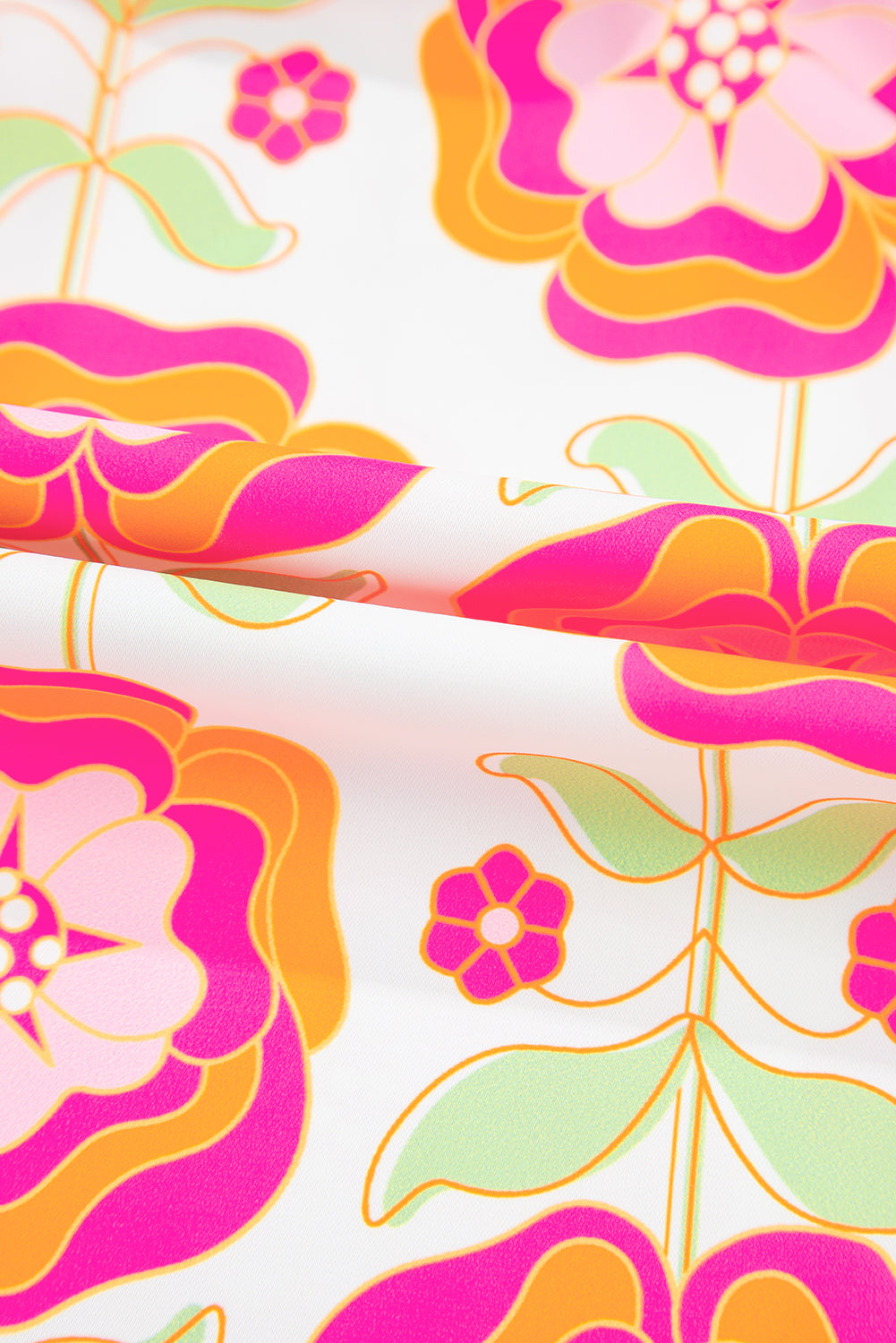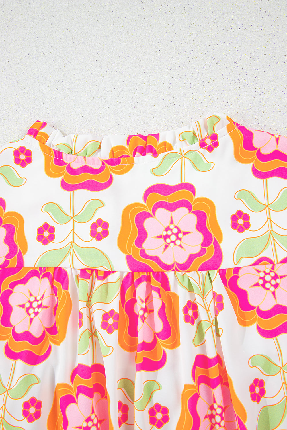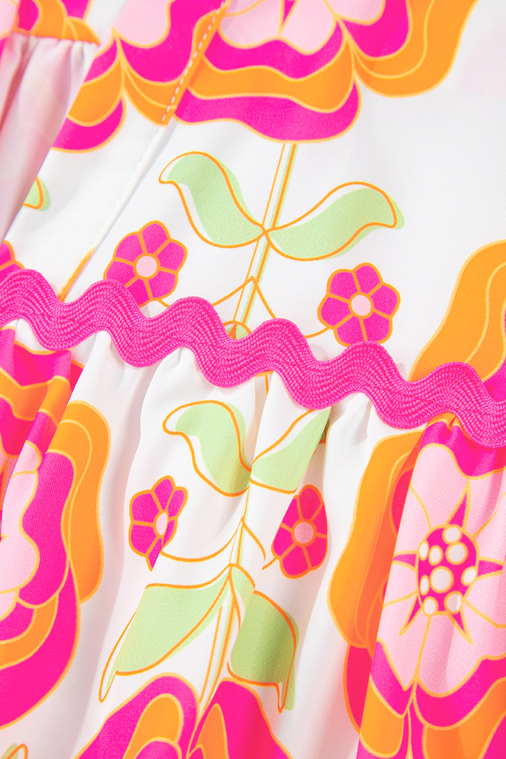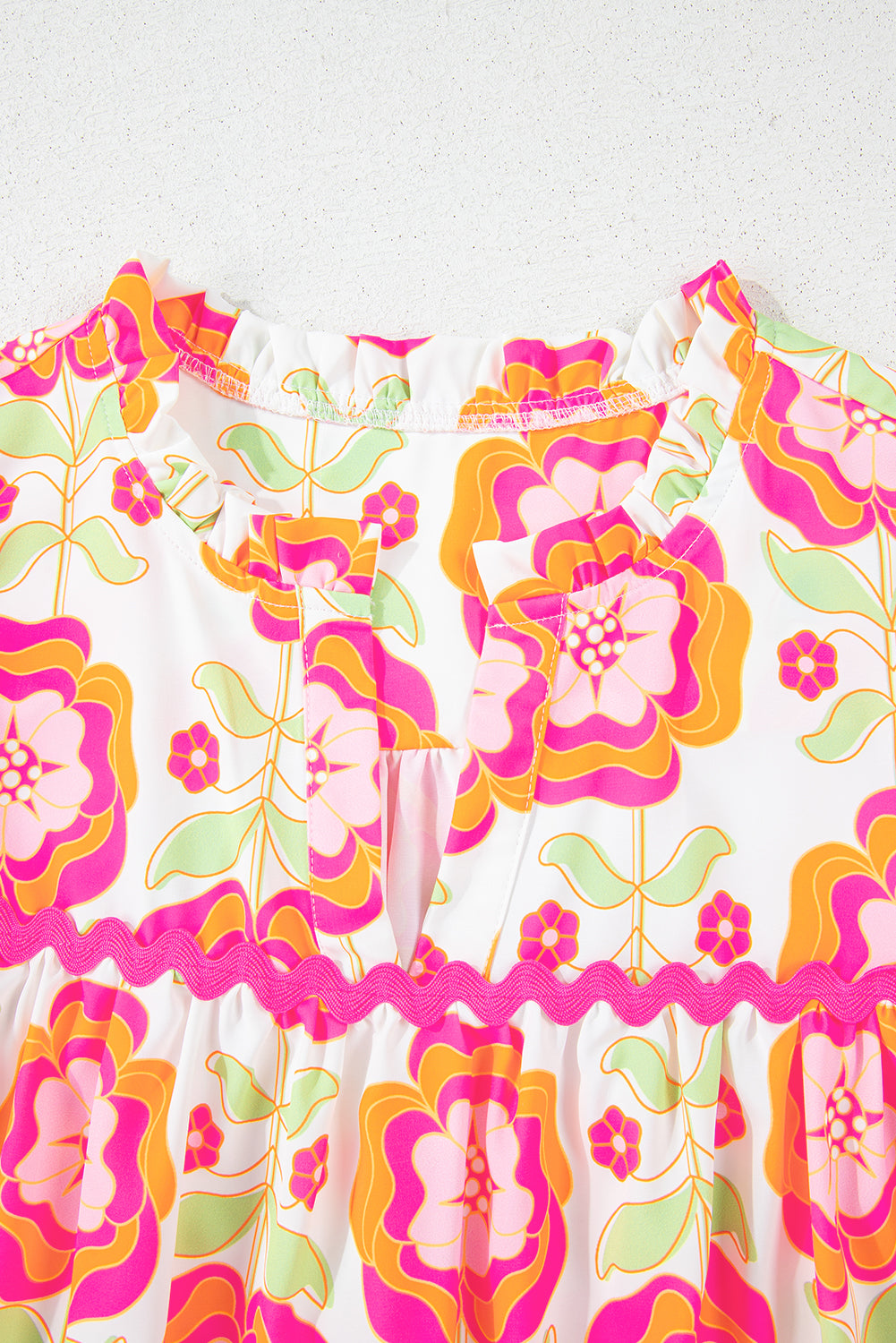 Floral Ruffled Sleeve Ric-rac Trim Split Neck Loose Blouse