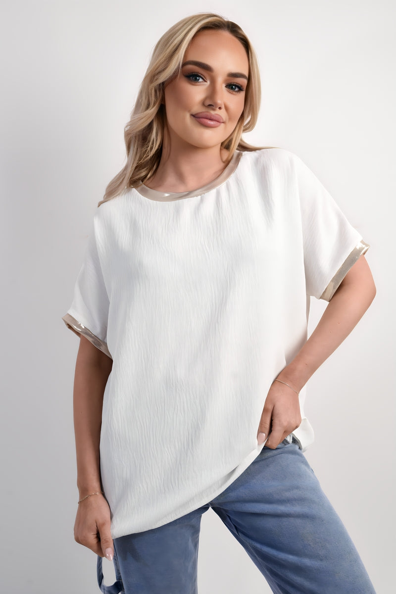 The Celia Shiny Trim Short-Sleeved Top is such a fun piece! It’s got a shiny trim that makes it pop, so you can look cute without trying too hard. The short sleeves keep it comfy and perfect for warm days. You can easily dress it up or down—wear it with jeans for a chill look or a skirt for something fancier. It’s super easy to mix and match with whatever you already have in your closet!