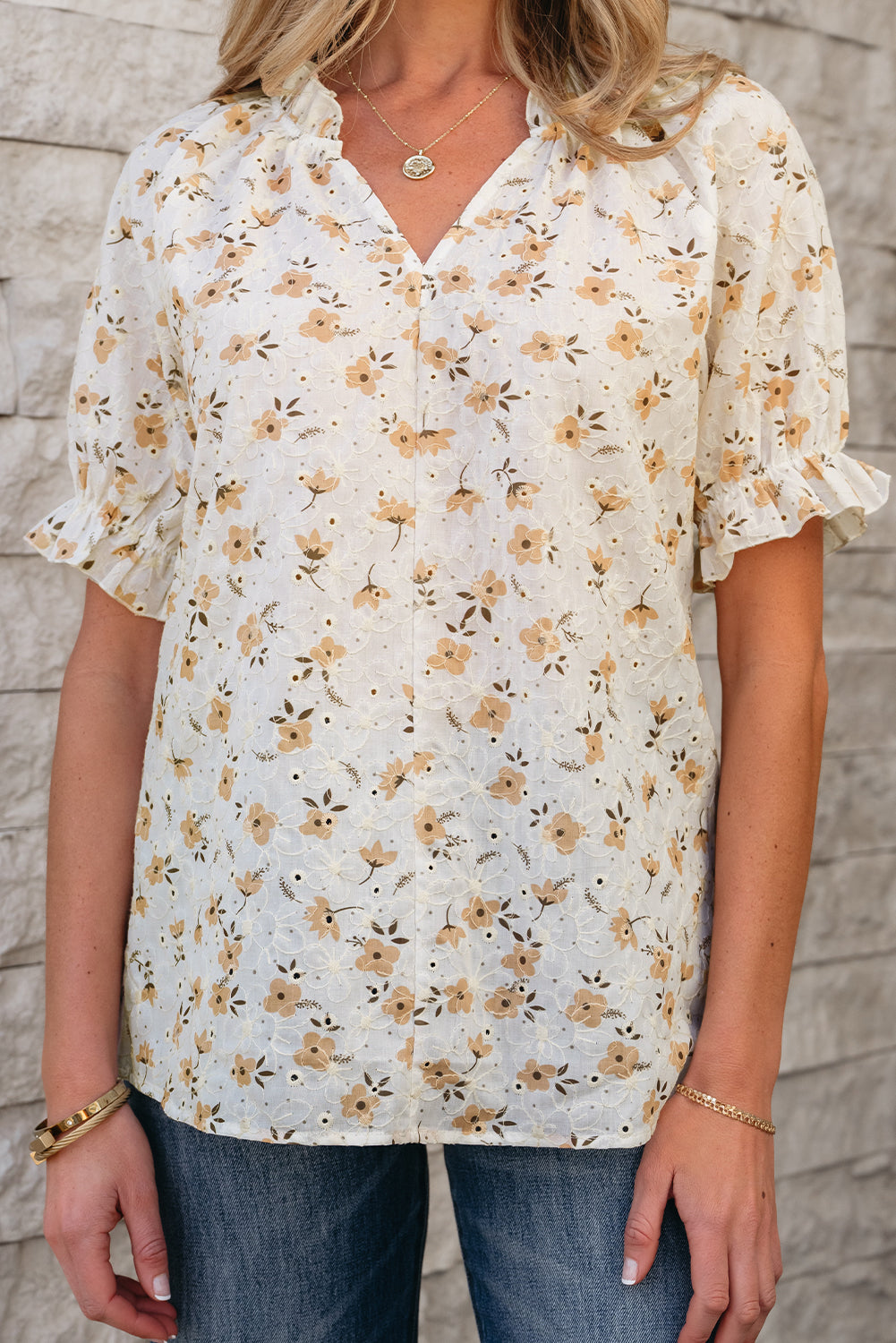 Floral Eyelet Embroidered Puff Sleeve Notch V Neck Blouse